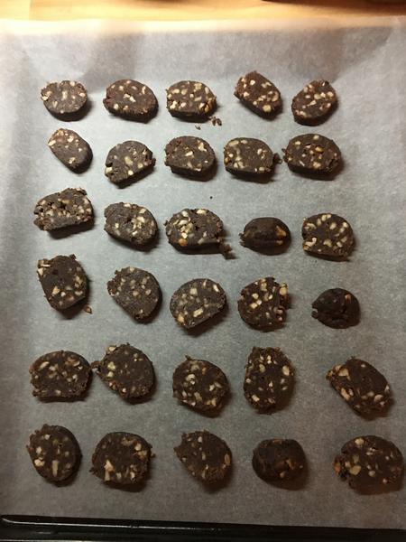 Ořechy na 2 hodiny namočte do studené vody, pak je nahrubo nasekejte. Přidejte ostatní suroviny a zpracujte těsto. Vytvarujte z něj válečky o průměru cca 4 centimetry a nechte v lednici nebo v mrazáku ztuhnout. Pak krájejte kolečka a pečte je v předehřáté troubě na 180 °C. Ještě horké obalujte v cukru.