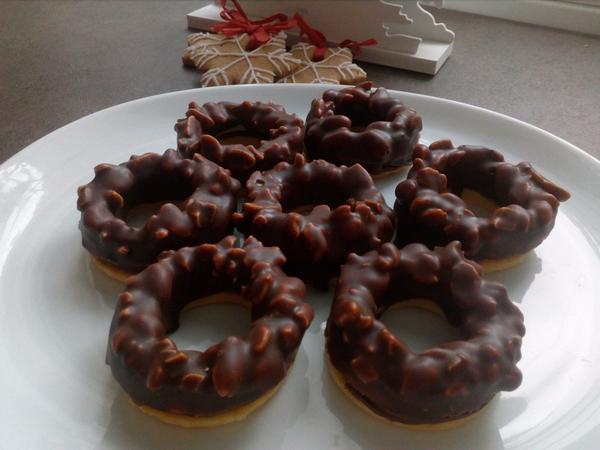 Upečená kolečka k sobě spojíme Nutellou a tu dáme pak zdobičkou i na vrch každého kolečka, obtiskneme do misky s arašídy a dáme ztuhnout do ledničky.