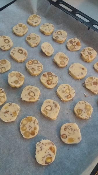 Těsto: 120 g oloupaných pistácií rozdrcených v mixéru na pastu, 100 g moučkového cukru, 2 bílky, 1 vanilkový lusk, špetka soli.