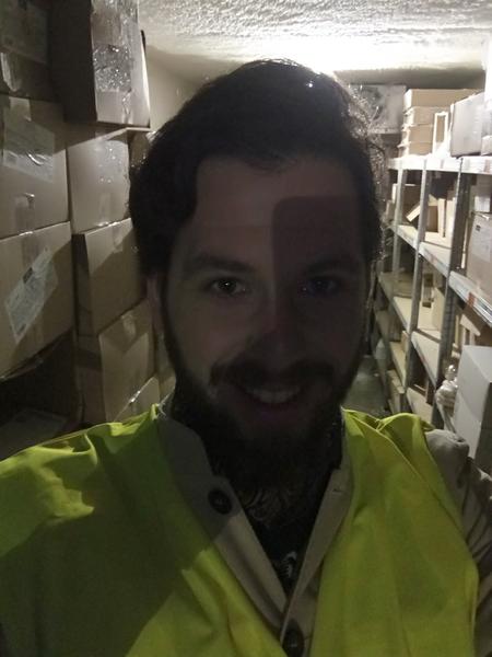 To co vidíte za mnou je ulička v takzvaném suchém skladu. Takových uliček, které se táhnout mnoho desítek metrů přes celý sklad a jsou vysoké jako třípodlažní dům tu máme několik - to aby bylo kam dát zásoby.