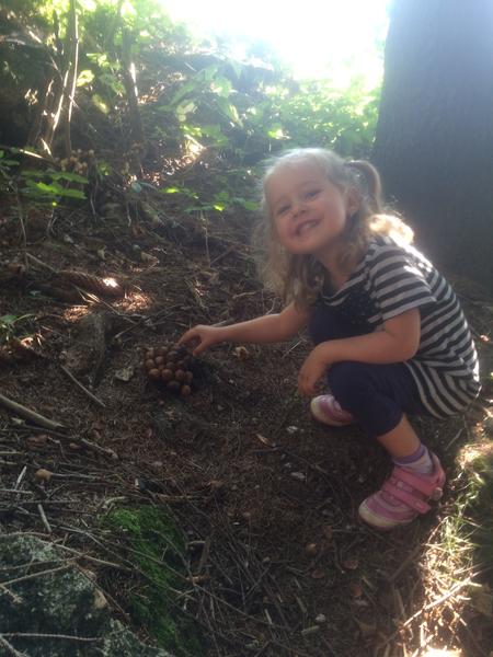 Chodíme denně do přírodu, minimálně na pole se psem, ale často i do lesa a za hezkého počasí klidně i na celé odpoledne. Nejradši má venku, když objeví nějaký klacek a může s ním zorat pole, nebo stavět domečky pro broučky. Sbírá šišky, hází je psovi, který to zbožňuje. No prostě si to venku užíváme a někdy jsem až překvapená, kolik toho nachodíme 🙂