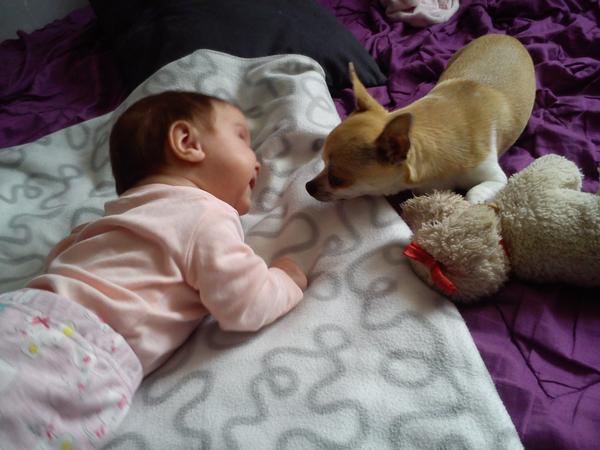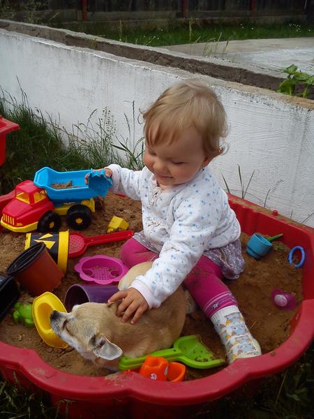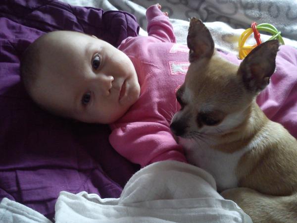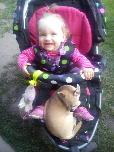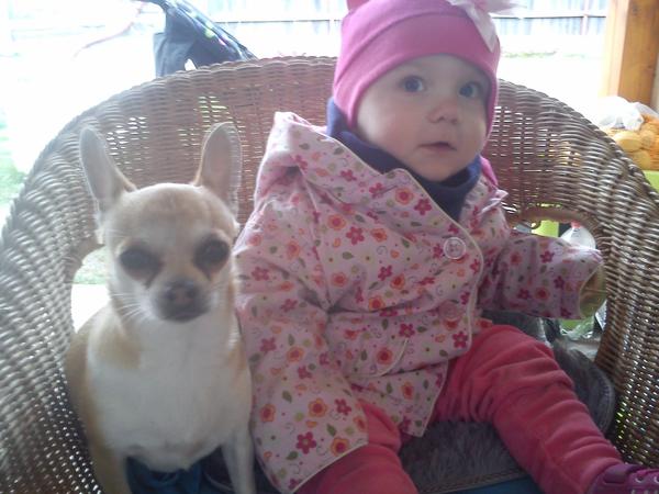 U nás je nejoblíbenější zvířátko naše čivava Annie...Karolínka s Annie si už od prvních dnů utvořily neuvěřitelně pevný a krásný vztah..tráví spolu skoro všechen čas a vše dělají společně....Káje je nyní 19m a je nádherné sledovat jak se vyvyjí nejen její motorika atd ale i dovednosti které okoukává od nás...třeba už si pamatuje že se s pejsky musí ven a první co mi ráno přinese jsou vodítka...pak jim sype granule, od začátku se respektují a karolínka přesně ví jaké hračky patří pejskům a které jsou jen její....ze začátku jsem měla strach jaké to bude mít doma psy a miminko a ted vím že to bylo nejlepší rozhodnutí a že každý by měl mít doma zvířatko a učit tak své dítě ke starosti a zodpovědnosti.....