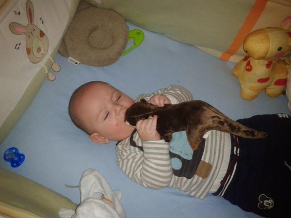 Tak nám je sice teprve 15dní, ale v postýlce máme Ledního mědvídka Hajánka a ten nám pomáhá držet neposedného dudlíčka.. 🙂 <3