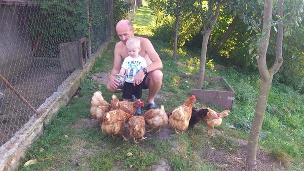 Tak u nás jsou nejoblíbenější slepice. Protože žádné nevlastníme, syn obchází všechny hejna v okolí. Došli jsme tak daleko, že jsme začali kupovat ovesné vločky, aby je měl čím krmit. Nejoblíbenější jsou ty, co bydlí o pár zahrad dál. Jak Lukynek vyleze za plot, tak už za ním běží a čekají na dobrůtku. Má je tak rád, že jim odevzdal dokonce dobrovolně i dudlík!