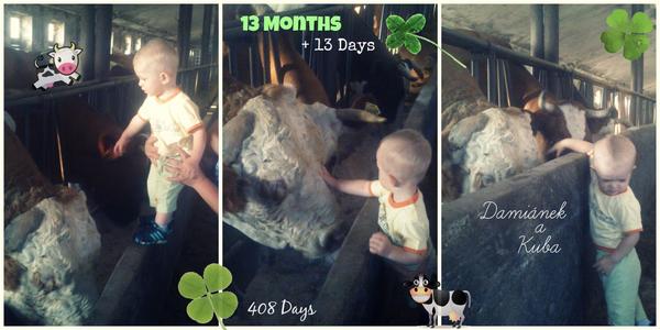 První odpověď, která mi vyvstala na paměti byl jednoznačně tvor jménem "Mimoň" 😀 ten je u nás nejoblíbenější, jelikož ale nevím, zda se dá toto stvoření považovat za zvíře ... vím na 100% jaké zvířátko u nás vede ... jsou to kravičky a býčci. Hned vysvětlím proč. Tchýně a tchán dělají v kravíně a JZD a tchýně se stará o kravičky s telátky. Náš nejmladší k nim jezdí na víkend a protože mají práci hned za domem, tak neexistuje, aby se nešlo zkontrolovat vše do práce. Má tak z první ruky krávy, plemenné býky a čerstvě narozená telátka, kterým může přidržovat flašku s mlékem. A aby toho nebylo málo, mají ještě doma sví hospodářství a tam prasátka, jedna zrovna před 14 dny přivedla na svět 6 malých růžových selátek, kterým jak vždy říká dělá "ňiňi" 🙂 a pak ještě býčka jménem Toník. Proto je naše odpověď dozajista Kravička a Býček a přikládám fotky místo slibů, jak si náš malý Damiánek v 1 roce hladí ochočeného, plemenného býčka Kubu.