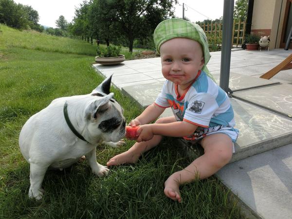 Nejraději má možná pejsky a kočičky, se kterými se často setkává. Prarodičů pejsek je starší a děti si drží od těla, ale od Honzíka se nechá hladit a sem tam jej olízne.