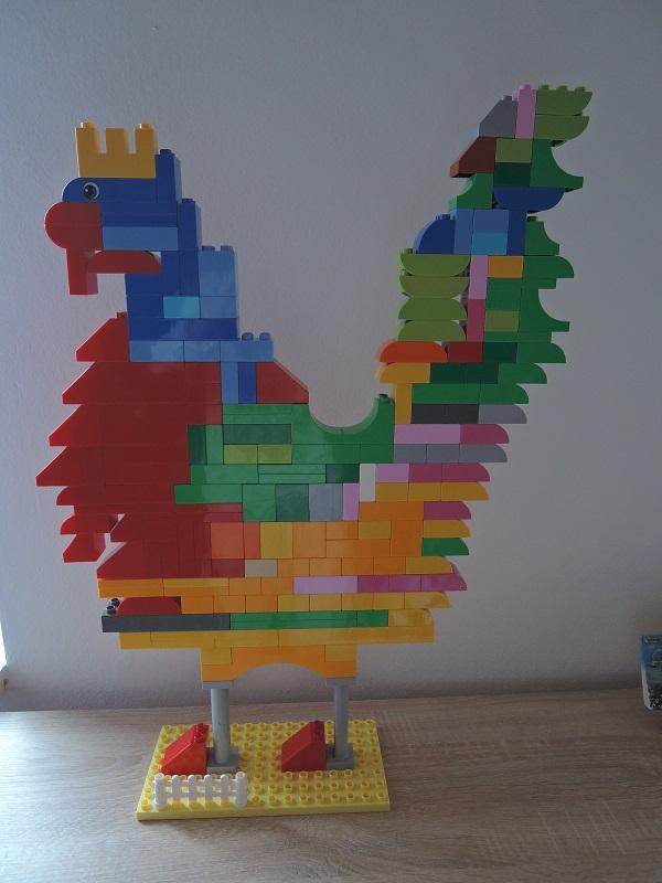Syn má, jako většina dětí, rád všechna zvířátka. Po prázdninách na vesnici (syn je městské dítě) teď frčí "obyčejná" zvířátka ze dvorku - kozy, králíci nebo kohout, který každé ráno kokrhal. Má ho spojeného s létem a mrzí ho, že ve městě nám žádný nekokrhá... Tak jsme si ho alespoň postavili z dupla...