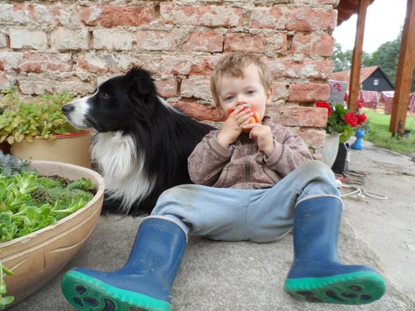 U nas je to nas pes Chuck, narodil se stejne jako dcera a spolu vyrustaji. Nejlepsi jak se pretahuji o hracku, to je pak smichu, kriku a stekotu kolem celeho baraku. Pak ma dcera rada I nase sleepicky a kaceny, ale nedavno ji jedna slepice klovla do zadku, tak Ted z nich ma respekt. Prikladam foto po narozeni obou raubiru