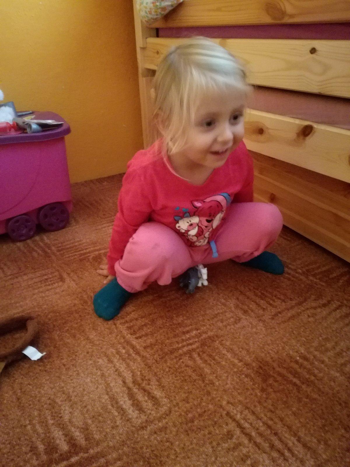 Starší dcera (3,5 roku) miluje koně. Má velmi ráda pejsky (u babiček a dědečků máme 4). My jsme z centra města a tudíž jí živé kamarády doma nahrazuje dřevěný tahací pejsek, skákací a houpací koník. Občas si hraje na doktorku a svoje zvířátka ošetřuje, dává jim meducínu, zalepuje jim bolístky. Když byla v cirkuse žasla na velbloudama a medvědama