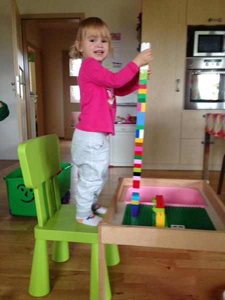 Tak my dnes takto 😉 Ted si radi hrajeme na policajty, takže toto je slepá ulice a kdyz auto vyjede až nahoru a dotkne se te blikacky, tak ta začne houkat a okamžitě si pro ne přijedou policisté 😉 No a Violka staví věže až do nebe a aby opravdu dosáhla až do nebe, vzala si k tomu i zidlicku 😉 No ale bohuzel někdy i komíny až do nebes padají 😂