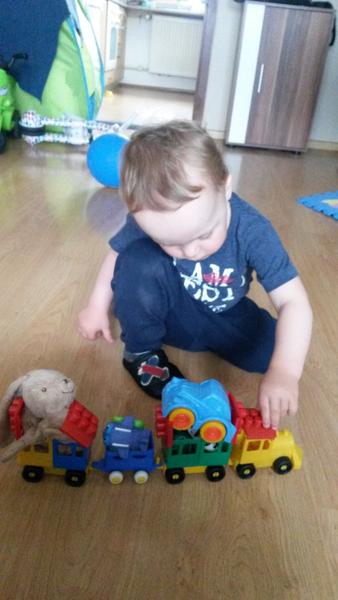 Syn má 13 měsíců, takže zatím maminka staví a on boří. Ale ať mu nekřivdím...komíny už se taky snaží stavět.