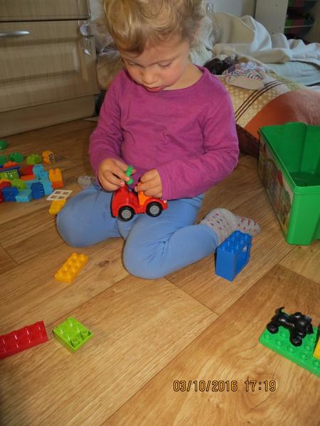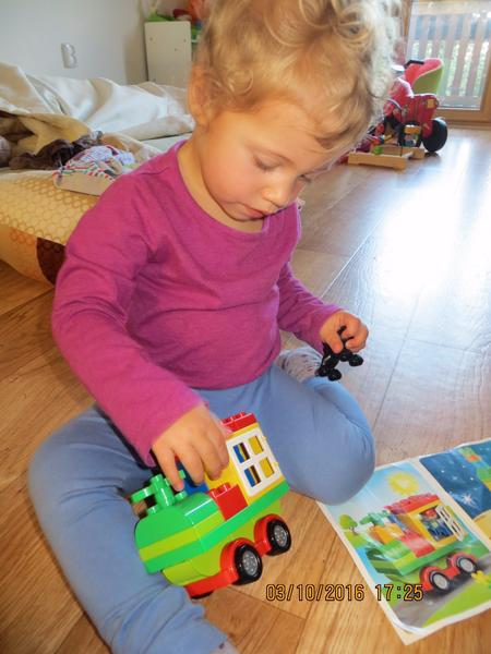 Malovat ještě neumím, sem tam čára a nějak zvlášť mě to ještě nechytlo, je mi čerstvě 1,5 roku ale stavět z lega auta, vláčky nebo třeba i náklaďák, to je jiná legrace🙂 Dneska jsem s mamkou postavila třeba táááákovýhle auto a můžete si bejt jistý, že by to mohla být i korba na náklaďák, který umí šoférovat pouze Ťapka, takže pokud bychom vyhrály a mohly ke korbě přistavit ještě náklaďák, přibylo by ještě více takového zaujetí ze hry, které je tou největší odměnou🙂 😉