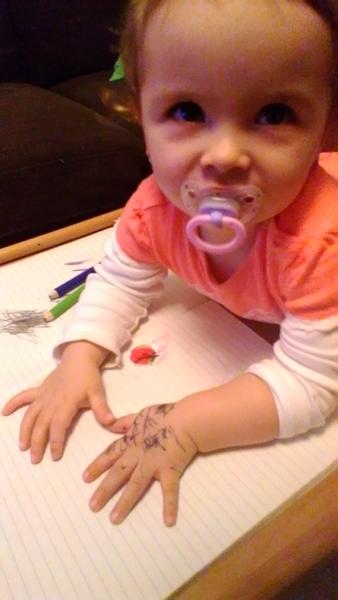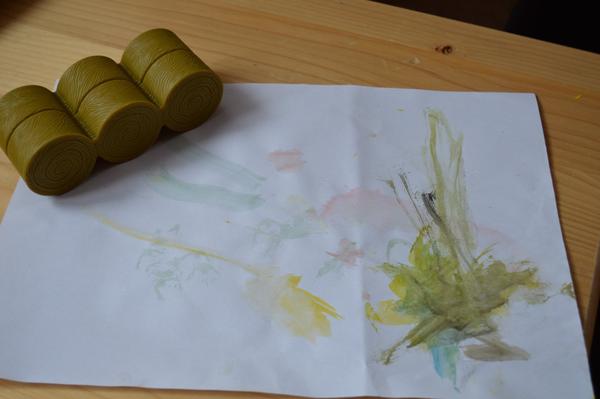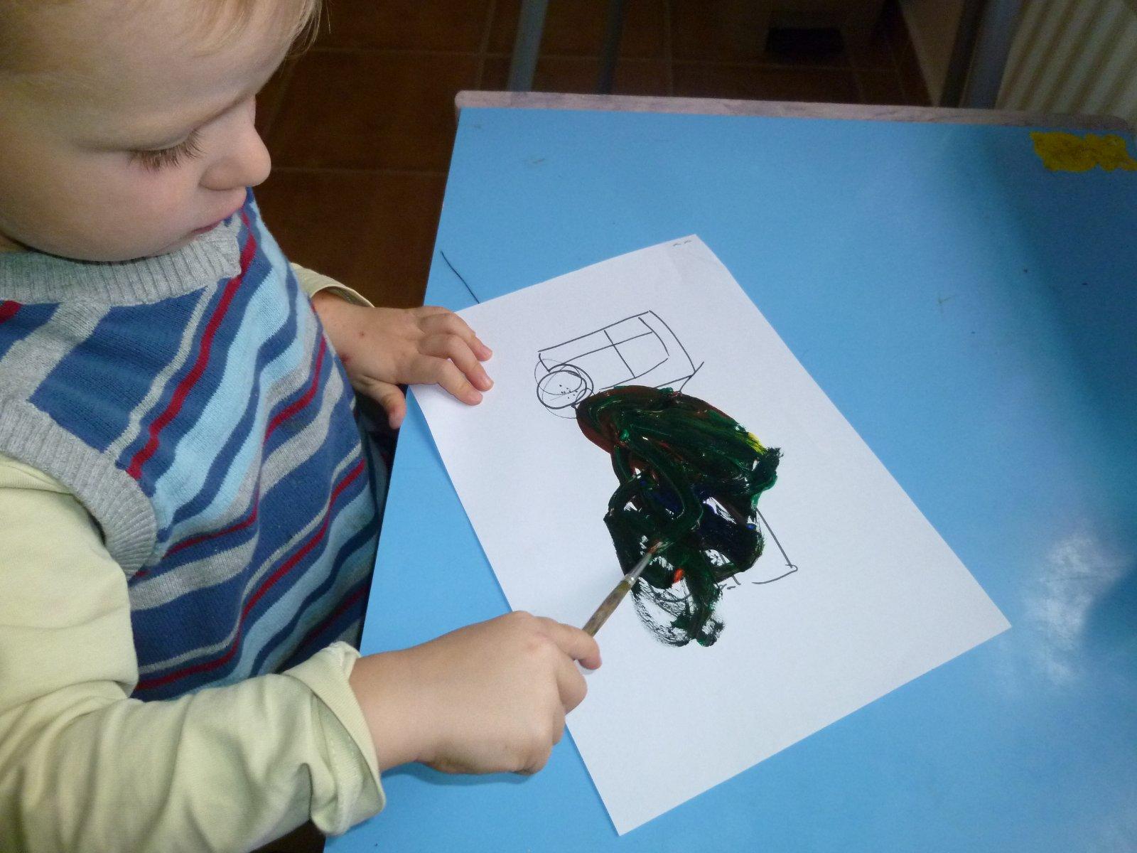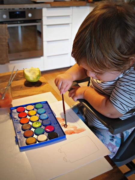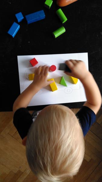 Když venku včera pršelo, tak jsme se k tomu konečně s naší čerstvou dvouleťačkou dostaly 🙂 Já jí předkreslila kostky-ona vodovkama vybarvila, já jí vystřihla náklaďák, kola apod-ona sestavila a nalepila, já jí dala zelený papír-ona natrhala a nalepila trávu, sama si vybrala v našem kouzelném tvořivém košíku samolepky srdíček a kytiček a že prej "takhle hezký!" TAKŽE NÁŠ NÁKLAĎÁK ASI VEZE NÁLOŽ LÁSKY A KVĚTIN. Nejlepší ale bylo to, že jí to bavilo a když si s tím pak začala hrát s opravdovými figurkami a tankovala benzín, tak jsem jen tála 😀 Nakonec jsem jí to pověsila na její "art wall" v pokojíku..