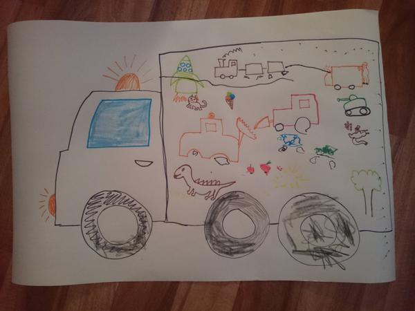 Moje představa byla jina😀 nakreslila jsem prazdny náklaďák a dostala vynadáno, ze takhle nevypadá, ale ze ho teda vybarvi....a nakreslí majak, protože náklaďák vozi maják 🙂 a pak uhlí. Moje dítě s velkou fantazií, kdy jsem čekala nalozenou rodinu, nemocnyho pejska atd, zůstal snad poprvé věrný realitě 😁
