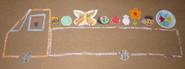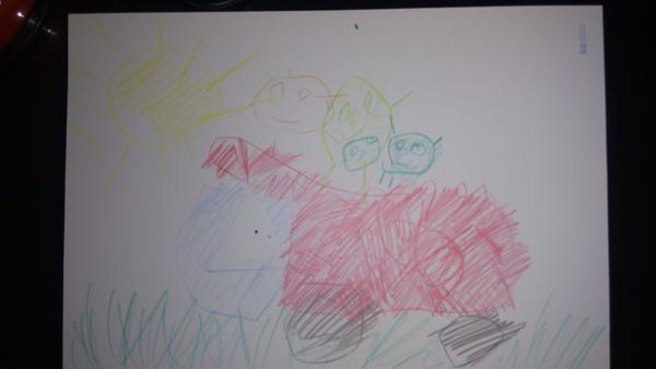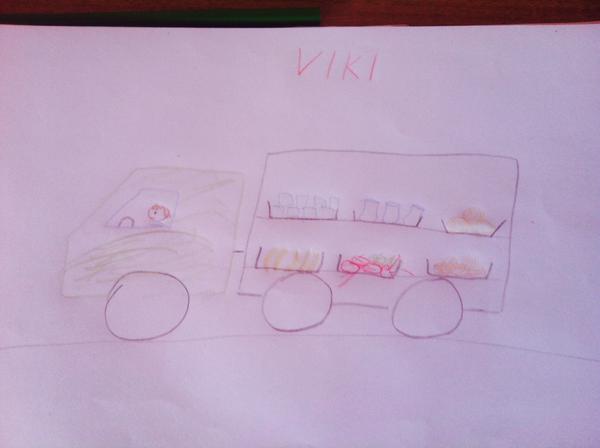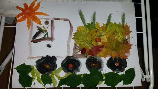 Dcerka ještě moc malovat neumí, ale co bychom vezli je naprosto jasné. Kaštany! Ty teď venku všude sbíráme a dcerka je vozí na všem možném.