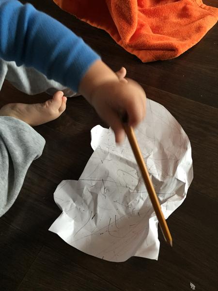 My ještě kreslit neumíme, malej Péťa má teprve 11měsíců. Ale rozhodl se taky zabojovat 🙂 Poprvé tužka v ruce, víc čar na podlaze, po oblečení a v dlaních než na papíře, ale snaha byla 🙂 A jako správný umělec své dílo ještě vlastoručně podepsal - zmuchlal 🙂