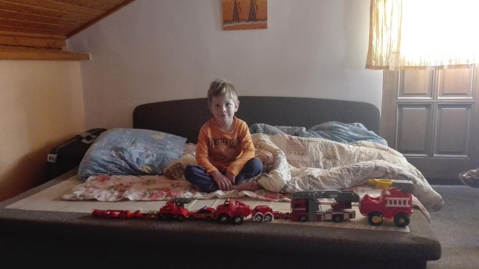 Nas Kebulka uz je zkuseny cestovatel. V lete vybehl na Boubinskou rozhlednu a jeste se několikrát vracel pro rodice sypajici do kopce. Na penzionku pak odpoledne neusnul on, ale my 🙂 Cestovat s nim musi samozrejme i jeho oblibene hracky. Tak se to nejak seslo, ze ma tri batuzky - a na každý vylet nutne potřebuje vzit všechny, pac není mozne, aby doma zustaly oblibene hracky. Kupodivu si je nosi opravdu on - a i když uz nemůže, proste ani jeden batuzek neda. To by snad radeji padnul na ceste. Udelat fotky na památku je pak na dlouho - musí se vyfotit i všechny hracky z batuzku. Fotky s dinousaury jsou z vyletu na hrad Kamyk (největší zážitek z vyletu mel ale ze slepic, které videl cestou), hasici zase vybehli s Kebulkou ten sileny kopec na Boubin.