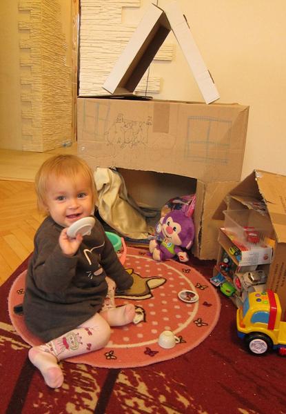 Děti dělají domečky ze všeho, ze židlí, z dek, pod stolem, občas z toho šílíme. Momentálně vítězí stavby z lepenky, zjistili, že je snadno dostupná a dá se z toho vyrobit vše. Třeba dům s garáží a piknikem, jak je na fotce. Testuje ho tam naše nejmenší, Karolínka.