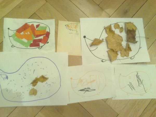 Druhého zleva nahoře kreslil uplne sám (i obrys, já jen čumáček a očičko). Ostatní jsem pomohla s obrysem. Kromě toho jsme měli asi 1000 kaštánkových ježků.