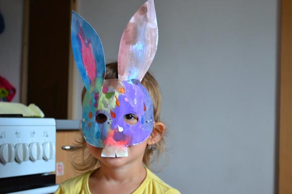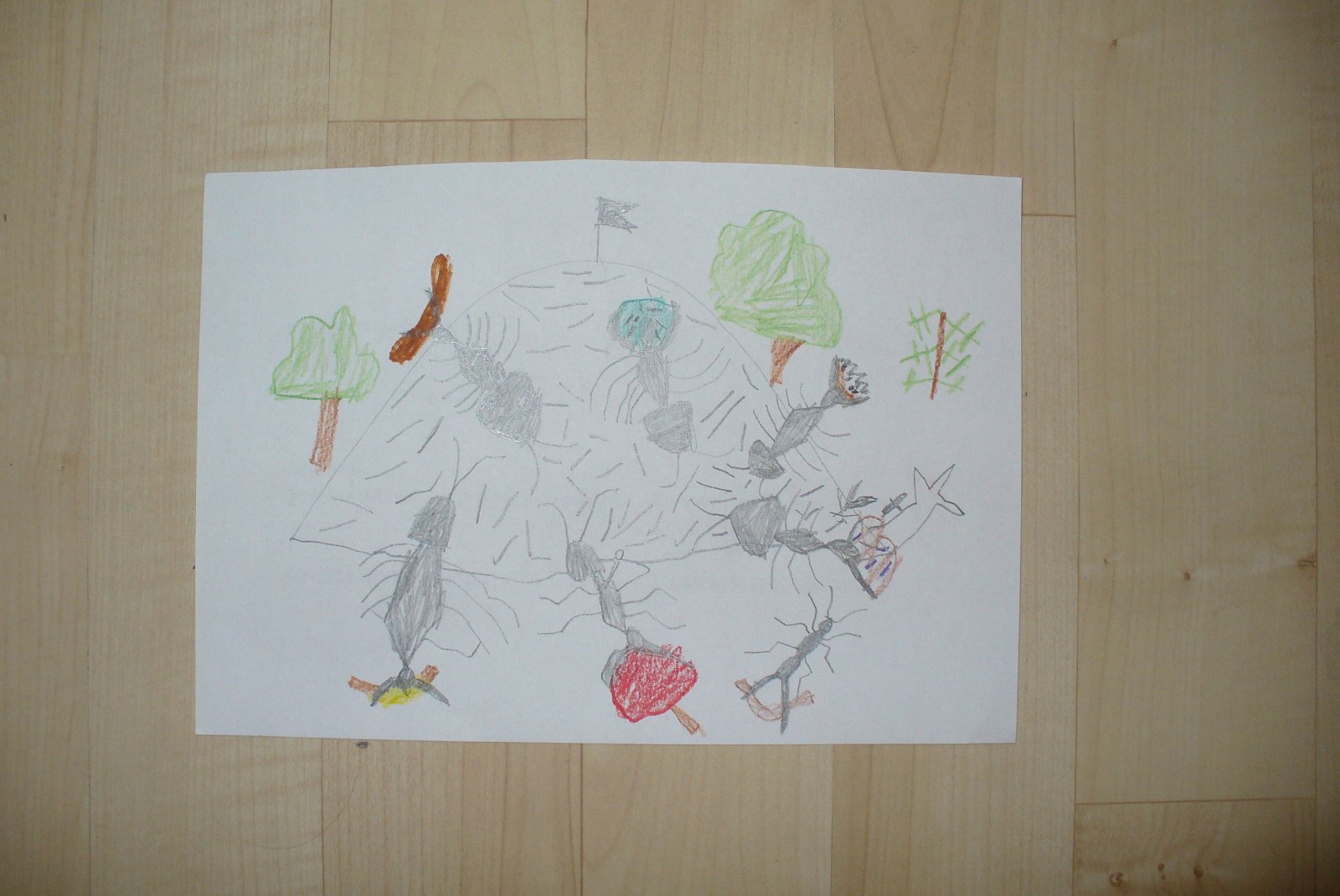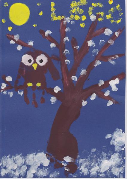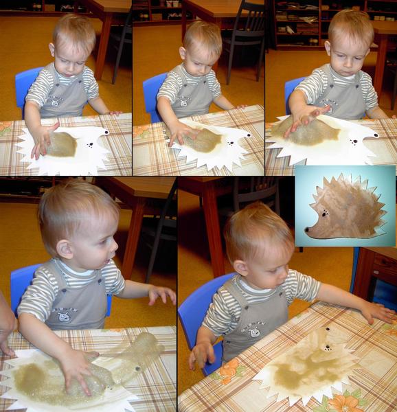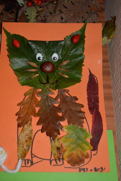 Johanka (3,5): vybarvila stromy a pozadí vodovkami, zvířátka a houby fixkami, vystřihala houby a nalepila kuličky z krepového papíru na podkladovou desku