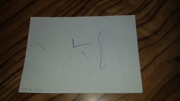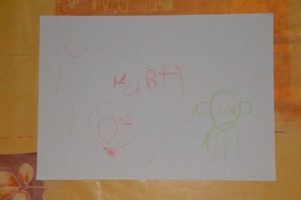 Malování sice není Kubíkova silná stránka, ale obrázek s oblíbenými zvířátky nakreslil a dokonce si ho i podepsal. Nebyla jsem si úplně jistá, o jaká zvířátka jde, oblíbenci se mění celkem často, ještě včera to byl jezevec, tak mi bylo sděleno- "Nakreslil jsem kočičku a nosorožeca. To nepoznáš, maminko? " Takže to vpravo, co vypadá jak zdařilý kříženec opice s chobotnicí je kočička a to vlevo je nosorožec. Má (kupodivu) správný počet nohou a vybarvený roh.