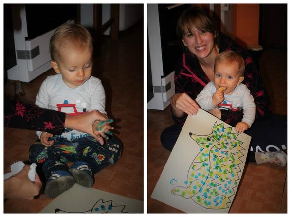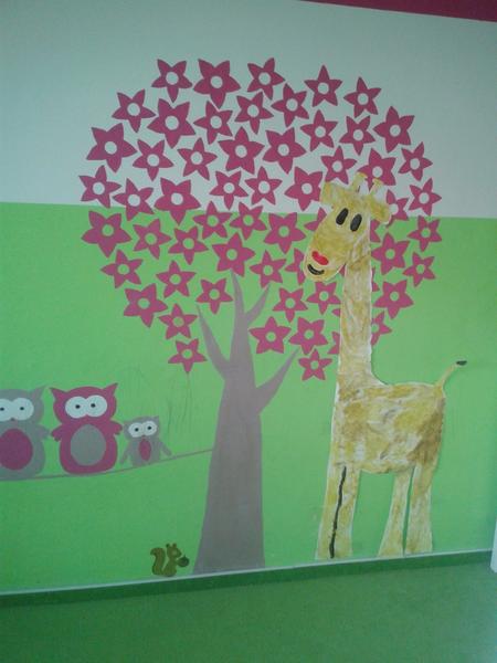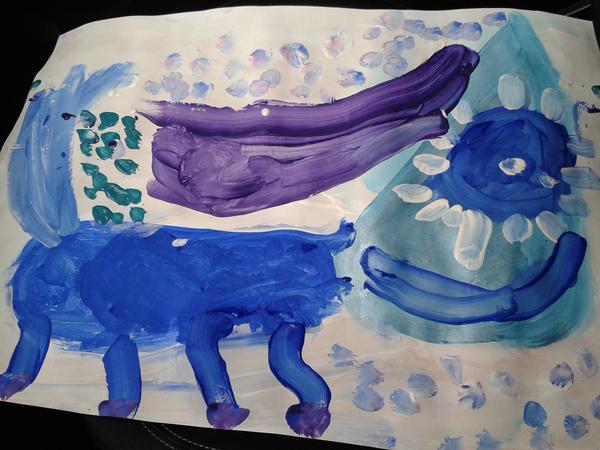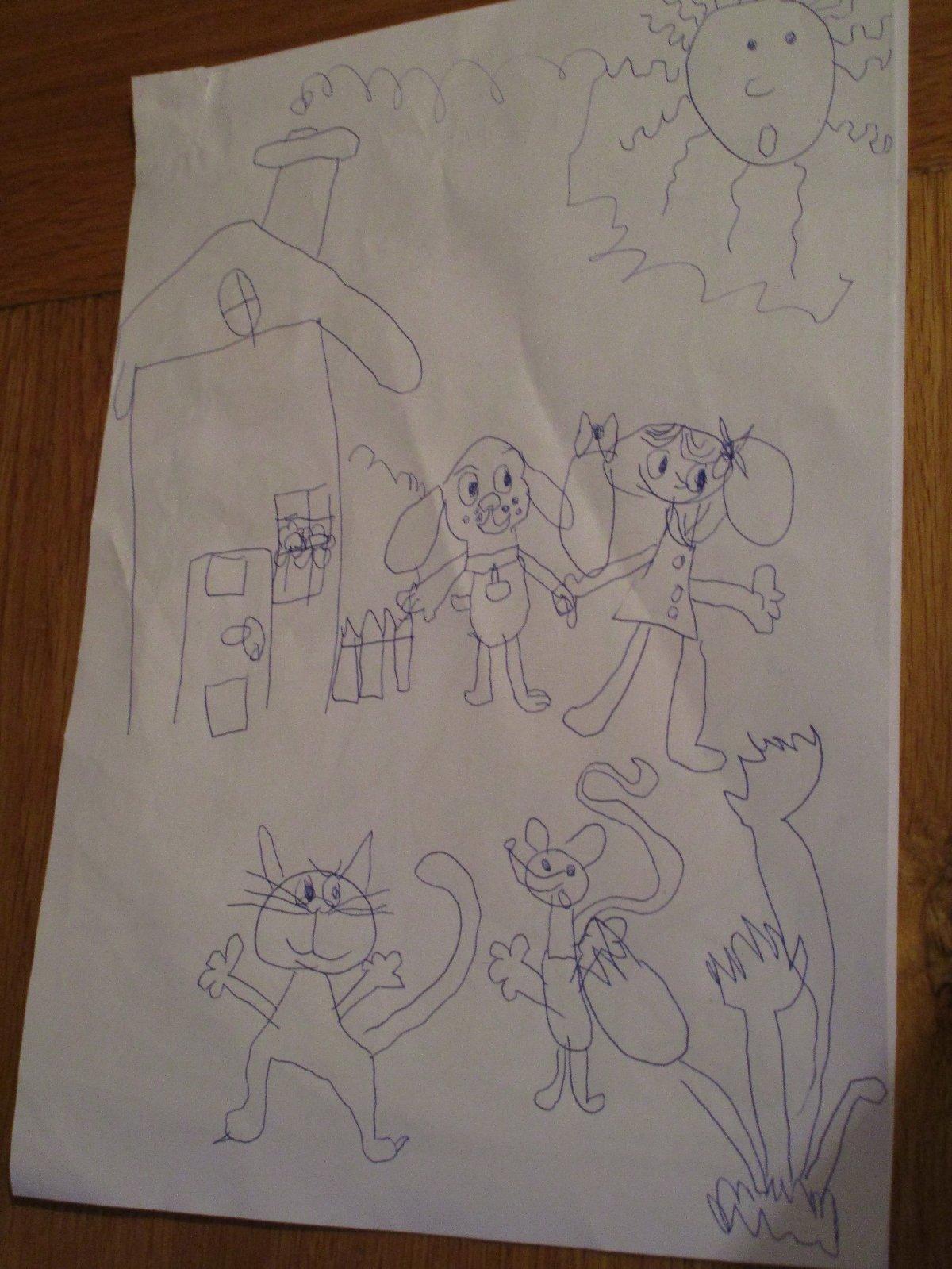 Syn tvoří rád a jak je vidět, i v lesní šklce se toho dá s dětmi udělat dost a rozvíjet kreativitu ;o) Ptáček i kachna jsou dobře rozpoznatelné, barevné cosi je strnad nebo stehlík (už nevím přesně který z nich :o) v bouři a "veledílo uprostřed jsou motýlci z chodidel našich dětí, na památku. Oblíbené zvířátko nemají, mění se to podle aktuálního dění. V současné chvíli je v kurzu myš.