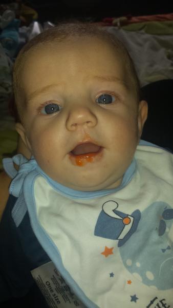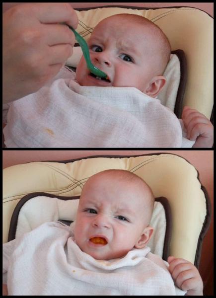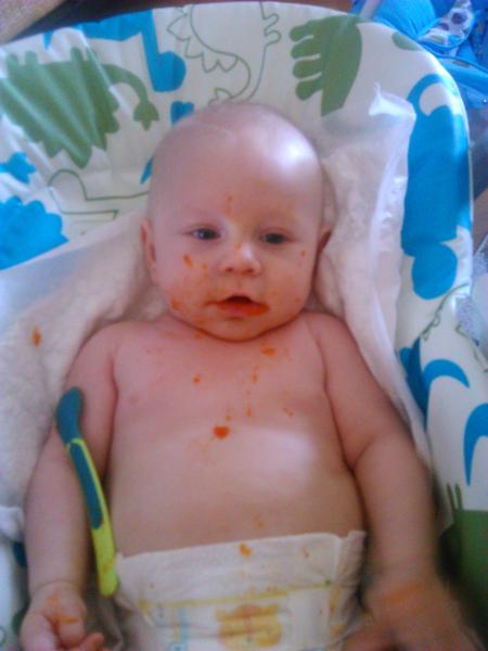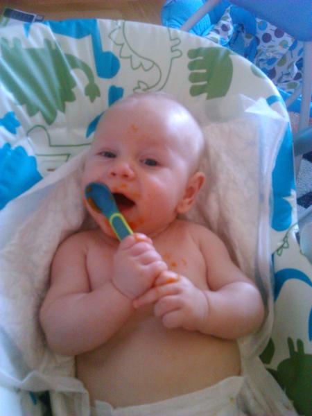 Začali sme mrkvickou po 4. mesiaci, a po pár dňoch mi už bral lyžičku a skúšal to sám, a tak aj vyzeral 🙂