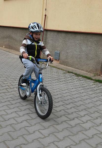 Ahoj, Jiřík dostal kolo uz na své 4té narozeniny. Jelikož je ale v září, tak milé kolo trošku zahálelo. Ted na jaře se z ničeho nic ozval dědeček, at napumpujem gumy, že pojedou s Jiříkem a by se naučil šlapat(do té doby nešlapal ani tříkolku). Sotva jse uspala mladšího synka, zazvonil telefon(cca po hodině) at se podívám z balkonu. A náš Jiřík nee jen že šlapal, ale dokonce jel na kole bez přídavných koleček🙂. Jen tedy trošku povyrostl a musíme sehnat kolo o číslo větší. Ale na učení posloužilo dobře. Ted ho zdedí mladší syn. Nikdy jsem nevěřila tvrzením že kolo bez šlapek je dobrá příprava na kolo s nii, ale ted už tomu věřím.