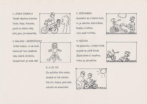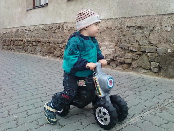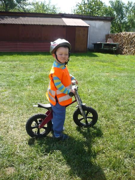 V roce a půl začne jezdit na Pukym, další rok na klasickém dvoukolovém odrážedle a další léto plynule přejde na kolo. ( toť plán)