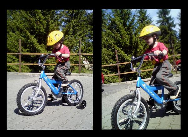 Nejstarší syn dostal své první kolo od bývalého tchána, když mu byl asi rok, ale musel si na něj chvíli počkat... Když mu byly asi dva roky, tak dostal tříkolku, šlapání pochopil poměrně záhy, ale tříkolky si moc neužil, protože většinu času trávil u babičky (tříkolka byla doma) a pak přišla zima a ježdění byl konec a na jaro už mu byla tříkolka malá... Tak sedl na to své malé kolo s postranními kolečky... Šlo mu to parádně... Když už se zdálo, že by mohl konečně postranní kolečka "zahodit", nastal velký problém... Rovnováha... Takže jsme opět nasadili kolečka a čekali, až z kola vyroste... Moc příležitostí na ježdění nebylo, takže odrostl poměrně "rychle" a v bazaru jsem mu koupila menší kolo a začali jsme pilovat rovnováhu - tradiční způsob našich rodičů... Podržet sedadlo, našlápnout, rozběhnout, pustit sedátko - a pád... Bylo mu asi 4 nebo 5 let... Veškerá snaha se zdála marná... Už se zdálo, že na kolo rezignuje a začne ho nesnášet - jeho vůle naučit se to byla dost silná, ale ani přes slzy a pády se nám stále nedařilo dostat rovnováhu ☹ Pak moje rodiče napadlo koupit mu koloběžku... Tam se musí naučit držet rovnováhu a pak při přechodu na kolo už bude vědět, co a jak, když se chvíli nebude odrážet a jen pojede... A opravdu... Po pár týdnech na koloběžce jsme opět zkusili kolo a světe div se - pokud se pořádně rozjel, rovnováha držela... Takže natrénovat nasedání, sesedání, brždění, pomalou jízdu, zastavení... No, naběhala jsem se za ním hodně, ale v šesti letech úspěšně jezdil na kole - konečně... Teď se chystá s tátou přes prázdniny pořádat na kole vyjížďky, tak uvidíme, jak dlouho jim to vydrží, ale na kole jezdí fakt rád... Dostal dárkem kolo se super výbavou, je mu sice ještě malinko větší, ale on to doroste 🙂