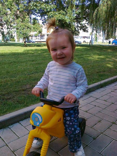 Jízdní začátky naší Sáry začínaly klasickým odrážedlem - motorkou, od 2. narozenin následoval First Bike, který milovala do poslední chvíle a nechtěla se ho vzdát. Jezdila na něm jako drak.
