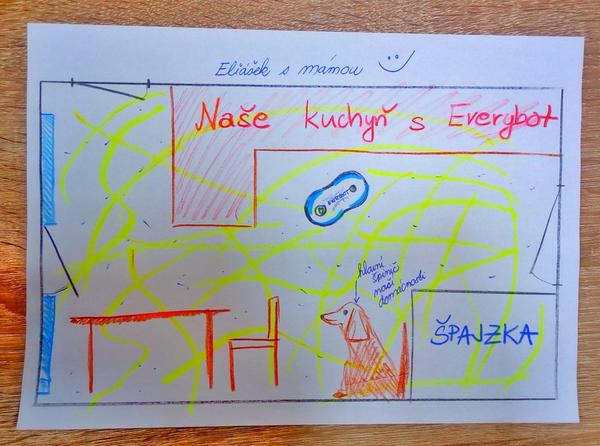 Na obrázku je naše kuchyně, kde probíhá asi nejrusnejsi život v naší domácnosti - takže jsme pro úklid vybrali tu. Bydlí zde taky naše fenka rhodeskeho ridgebacka, která za svůj život pustila už tolik chlupů, že bychom si z nich mohli složit celou psí smečku. Na zemi syn nakreslil "bordel" - to jdou ty čárky a na úklid vybral svítite žlutou barvu, aby bylo vidět, že po úklidu Everybotem zem září čistotou 🙂