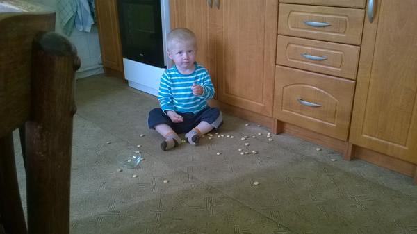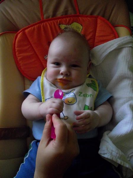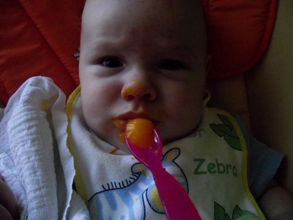 Foto je z prvních příkrmů kde snědl pár lžiček, ale jídlo bylo všude 🙂