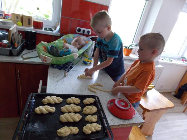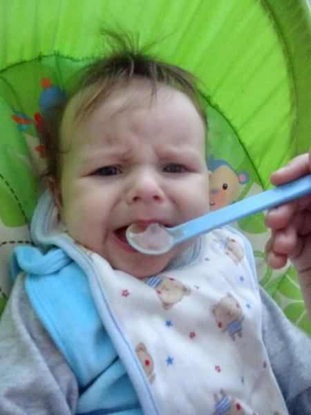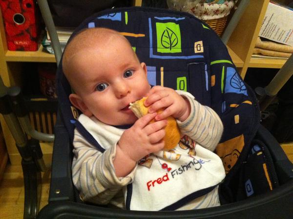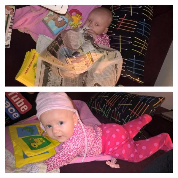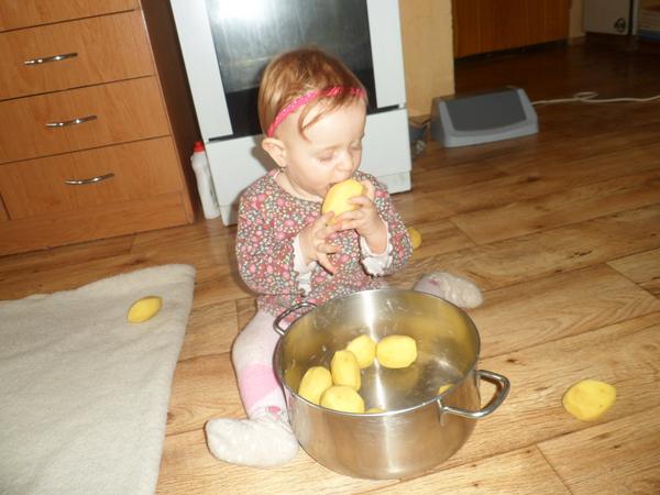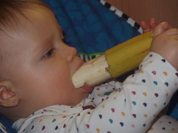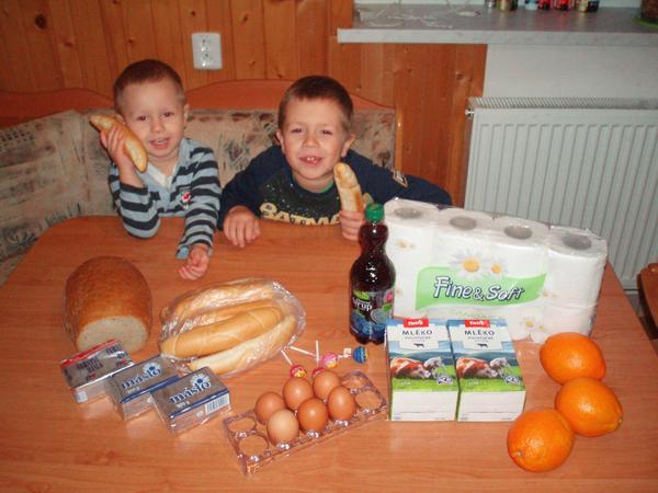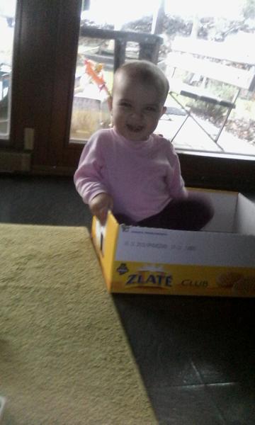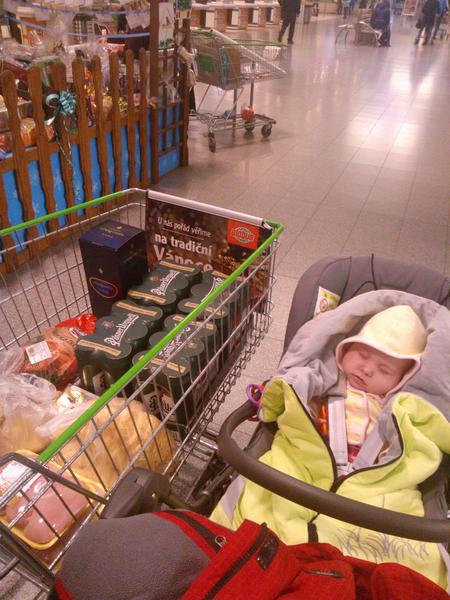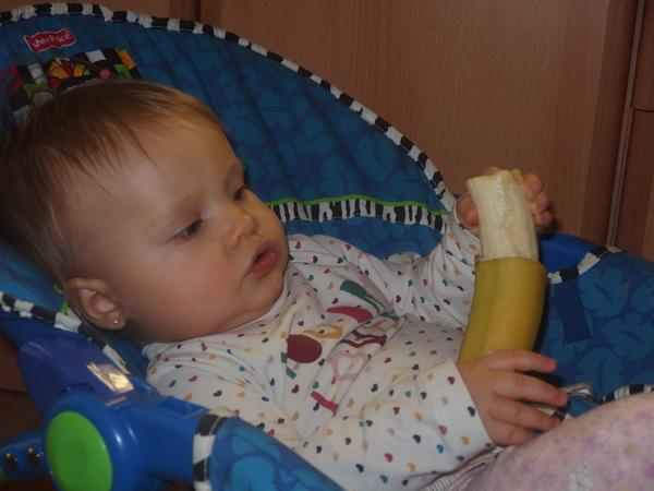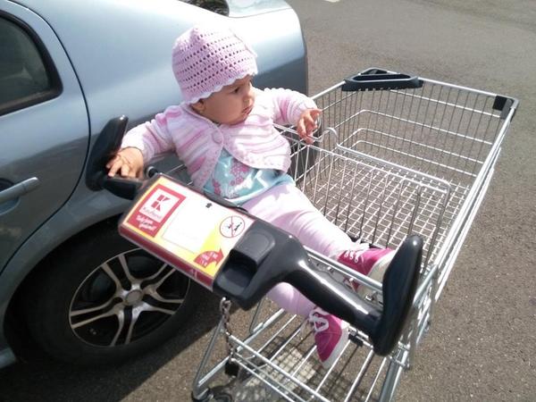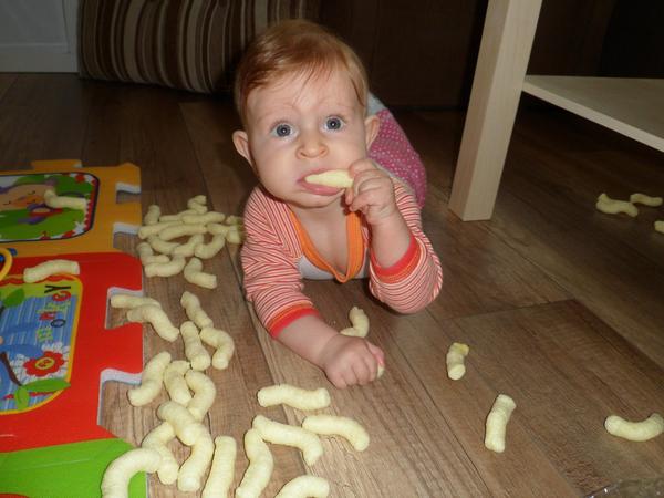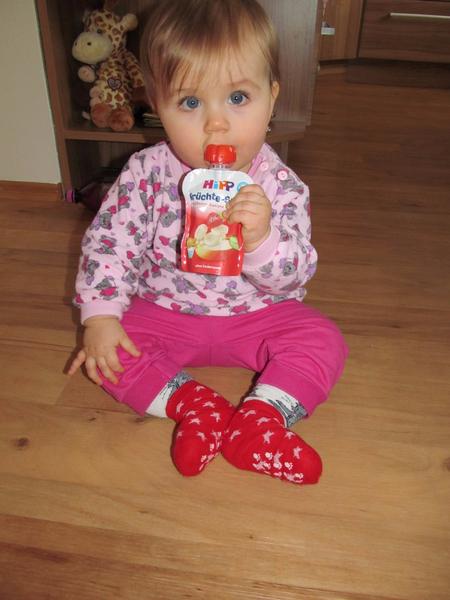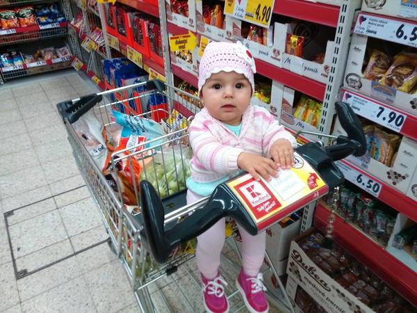 U nás nesmí chybět v košíku rohlík (jen v obchodě vidí, jak je dávám do sáčku, tak už vydává zvuky, jakože jeden chce a hned, klidně by ho jedla spolu s igelitovým pytlíkem 🙂), křupinky a poslední dobou i jogurty a banány. Je vtipné, jak už takhle malé děti poznají svoje oblíbená jídla i podle obalu.