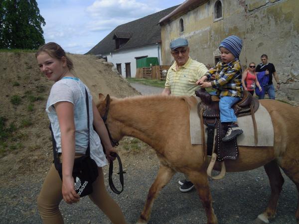 Volný čas trávíme spolu nejen se synem a manželem, ale také se dvěma sestřenicemi na zahradě, kde pro vnoučata děda postavil zahradní železničku, kde jezdí mašinky. A jelikož bylo teď o víkendu krásné počasí, trávili jsme čas 🙂 na Historickém jarmarku v Kladrubech. Děda s babi zaplatili Matýskovi jízdu na poníkovi(seděl na něm poprvé) a pak když mě taťka vezme na koníčka na jeho záda, tak babi se mnou dělá "lumpačinky". A myslím,e Matýskovo výraz mluví za vše, hlavně, že je spokojený a my také.