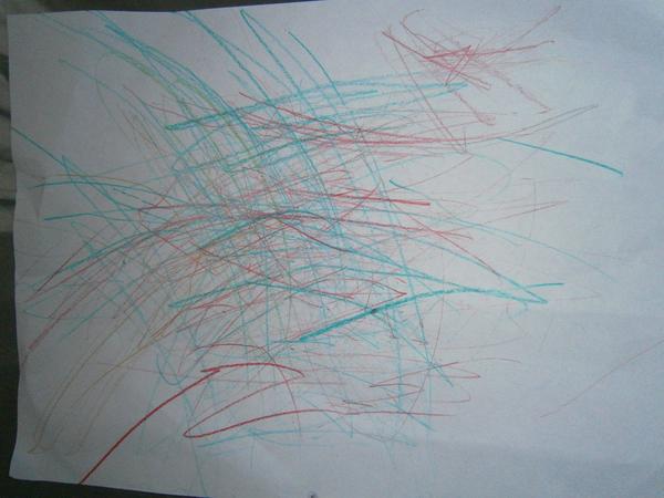 Na obrazku je jeho "lod na vode s vlnou", vesmes první obrazek, kde je kreslena věc i poznat, víme-li co kreslil 🙂 Kebulka ma 2,5 let a zatím vicemene kresli kolecka a cary.