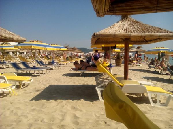 Pláž: čistá, pozvolný vstup, což bylo bezvadné pro děti. Lehátka, slunečník-4euro/ks. Ale dá se na místě koupit slunečník za pár korun.