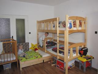 jankatr na ten zebrik bude mit problem vylest i dospely, natoz dite, takze zatim pohoda, ale uz tam lezou. Vy mate tu palandu vymakanou, je super s tim 3.luzkem. Chata uz mi leze zubama, preci jen, kdyz je tam clovek porad, tak uz je rad, ze prijede do Prahy.