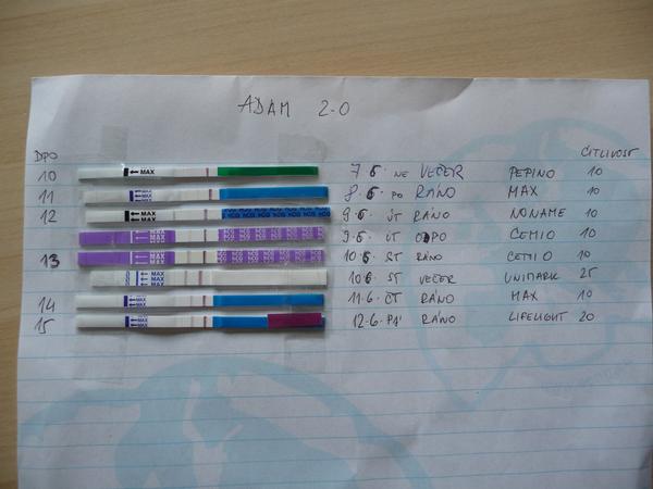 @korticka Ahoj, já jsem trochu prdlá s tím testováním... ale nemůžu si pomoct. Ty testy co tu dávám jsou sice skoro všechny každý jiný a mají i různou citlivost (pohrabala jsem doma všechny zbytky), ale celkově sílí a docela rychle, až jsem překvapená, za 5 dní od ducha po dvě čárky... Ten 10 dpo je ten duch, na fotce ale není vidět. Jediný co je tam dvakrát je LadyMax. Tož kukni 🙂