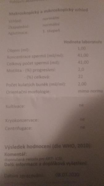 já muže testovala v rámci diplomky a výsledek byl blbej. Malá koncentrace, špatná pohyblivost i morfologie, ale byla jsem ve 20tt...prostě vážně někdy stačí 1 🙂