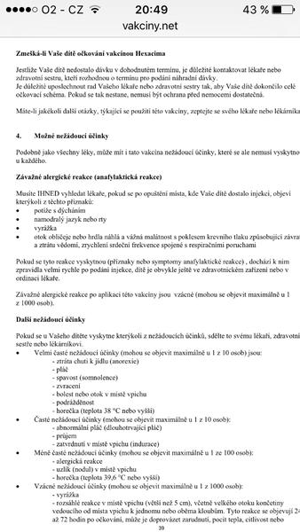 víš co, mám pocit, že ty to tak trochu podceňuješ...jak jsem psala, pokusného králíka ze svého dítěte dělat nenechám a proto jsem šla do té vakcíny, která je na trhu dýl...navíc jak už tady bylo zmíněno, infarix hexa obsahuje úplně jiný druh hlinitých solí než hexacima, tedy z pohledu toho která je šetrnější to zřejmě vychází na prázdno. Pak pokud je v ČR možnost volby, tak si s dovolením zvolím tu bez toho černého trojúhelníku a jsem v klidu...