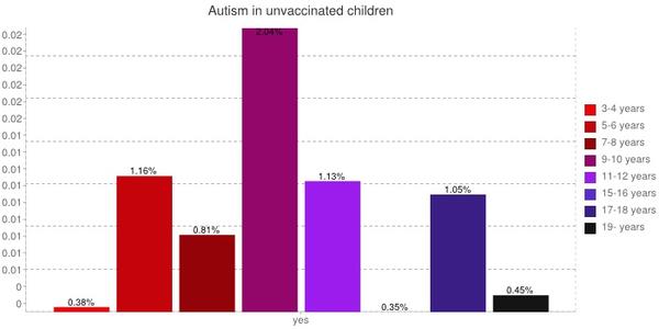 a tu išlo o skupinu, kde najväčšiu časť neočkovaných deti predstavovali deti do dvoch rokov a tie sa porovnávali v chorobnosti so všetkými deťmi do 18 rokov, čo je na pováženie, lebo deti do dvoch rokov častokrát na mnohé choroby ešte nie sú jednoducho diagnostikované, ale čo ma dorazilo na tomto dotazníku bole, že v skupine 9 až 10 ročný neočkovaných detí hlásili rodičia dvojnásobne vyšší výsykt autizmu ako v bežnej populácii a ano išlo tu o internatový dostazník, ktorý ani nebol nijako obsiahly, ale dokonca obsahoval možnosť je chorý alebo je zriedkavo chorý, ale pre neočko detí, čo je tiež úply nezmysel. Záver...oblbovačka.