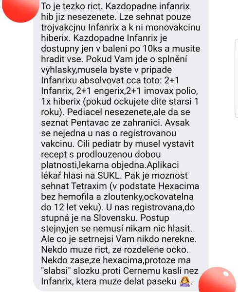 @xtina123 Ahojky, nakonec ne, já ji sehnala jinak, ozvala se mi známá, co jí dvě zbyly. Je to ale drahota. Nehrotila bych to, pokud je to takhle drahé, myslím, ze to za to nestojí, já mám osvícenou pediatričku, co ví, že je pediacel dobrý, a stejně je i pro hexacimu, která podle ní opravdu ty následné reakce mívá málokdy.