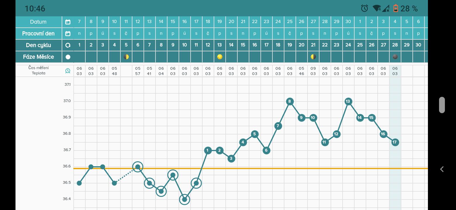 Dobry den. Jsem dnes 17.DPO a menstruace zatim stale nikde. Ani zadne spineni. Jen teda teplota posledni 2 dny uz trochu nizsi. Je jeste nejaka sance, ze by z toho bylo tehotenstvi? Vim, ze si mam udelat test. Ale do lekarny se dostanu az v pondeli. Jinak teda 15.DPO uz jsem myslela, ze se menstruace blizi. Bylo mi cely den spatne, bolest bricha az nevolnost. Chvilemi mdlo a bolest hlavy. Na druhy den ale uplne v pohode... Prikladam graf bazalni teploty
