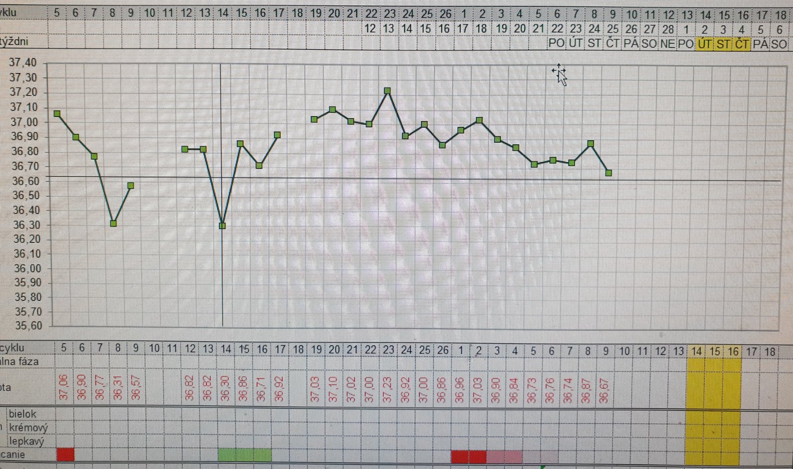 @luckamatylda máš normální záznam, klesá většinou těsně před ovulací.. pokud se snažíš o mimčo, dělej k tomu ovu testy, ať ovu neprošvihneš..