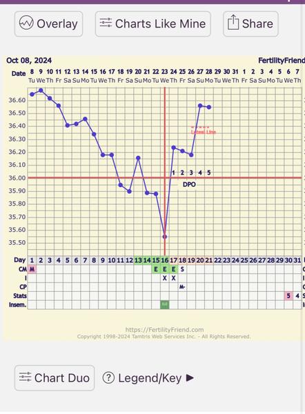 @anorila zatím ovulace neproběhla, není tam žádný pokles teploty. Jak máte od Dr potvrzené že ovulujete? Jedna věc je viditelný folikul na utz a druhá věc je jestli vyzraje tak aby se uvolnilo a prasklo🤔. Jinak i kdyby pokles tento cyklus nenastal tak by se jednalo o anovulacni cyklus a ten může mít i každá zdravá žena jednou do roka 😉