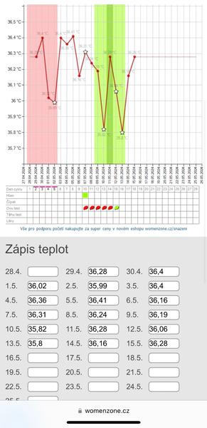 @lencaa11 Ahoj prosím potrebujem poradit. Prvýkrát som zacala merat bt a robila ovu testy od 10DC. Pozitivny bol 15DC jak som dávala predtým test,bolesti v podbríšku boli 15,16DC ale nechápem ten moj graf :? je pravda ze od 16DC meriam o tri hodiny skorej 3:30hod pretoze mam ranní smenu a inak to nejde predtym som od zaciatku merala 6:30hod aj cez vikend. pripočítava sa tam nieco ked meriam o tolko skor nez zvycajne? je možné že kvoli tomu nevidim vyskocenu teplotu na grafe? okrem tej teploty by som povedala ze vsetko nasvedčuje ze ovu prebehla. Prosim poradte :( prikladam foto