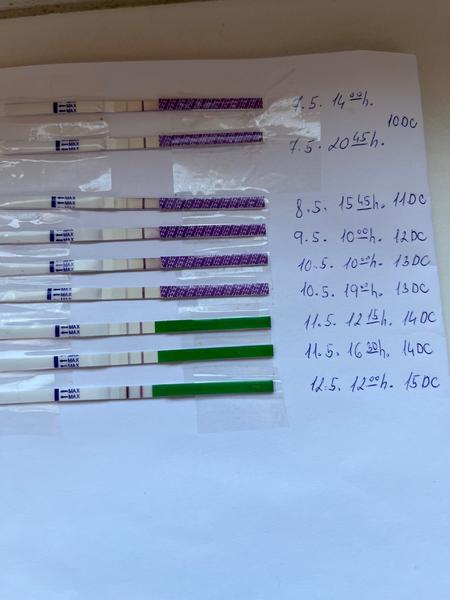 @simni Zatím to vypadá dobře, jak povídají ostatní. Test je zatím negativní, ale sílí - když bude pozitivní (stejně silné čárky), do cca 2-3 dnů může proběhnout ovulace. Bazální teplota by zatím měla být nízká, stoupne až po ovulaci, protože teplota stoupá pod vlivem progesteronu, který se tvoří ze žlutého tělíska (z prázdného obalu od vajíčka). Zvýšení teploty by tak mělo být zaznamenáno až po ovulaci. Jestli ovulace proběhla určitě, zjistíš tak, že se bude alespoň další tři dny teplota držet nahoře.