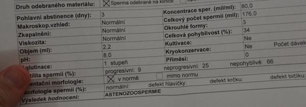 @rosalindamelinda Spermiogram v norme neni, proto je tam i zaver astenozoospermie, coz znamena, ze jsou spermie malo pohyblive.