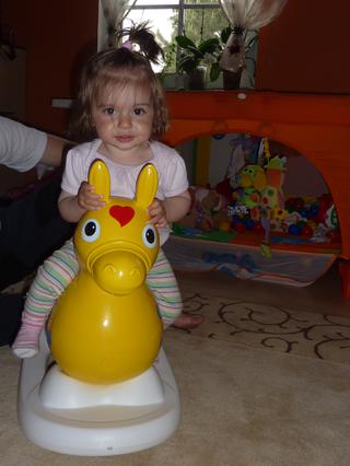 Slečna krásně chodí kolem stolu, kolem zdi, prostě kolem všeho, když se může přidržet. Jinak si sedne a doleze si kam potřebuje, na samostatné chodzení je lenoška a za ručky ju netahám, stejně ju to moc neba… ven berem velkou deku na trávu na hřiště a to je spokojenost, čučíme na děcka a svačíme a tááák.. no houpačka jasnééé